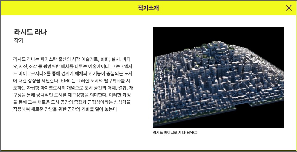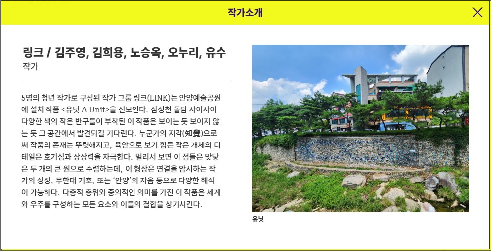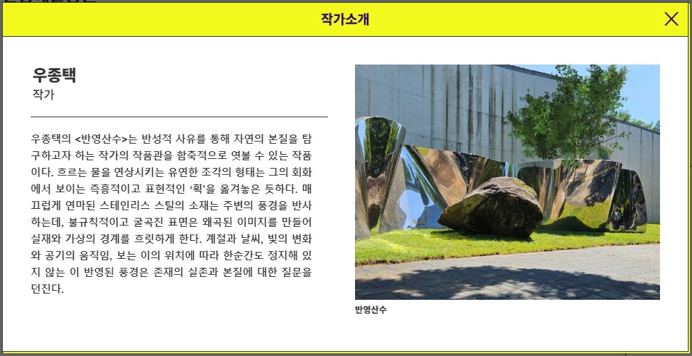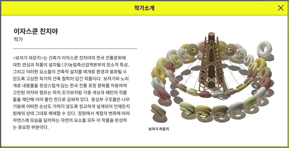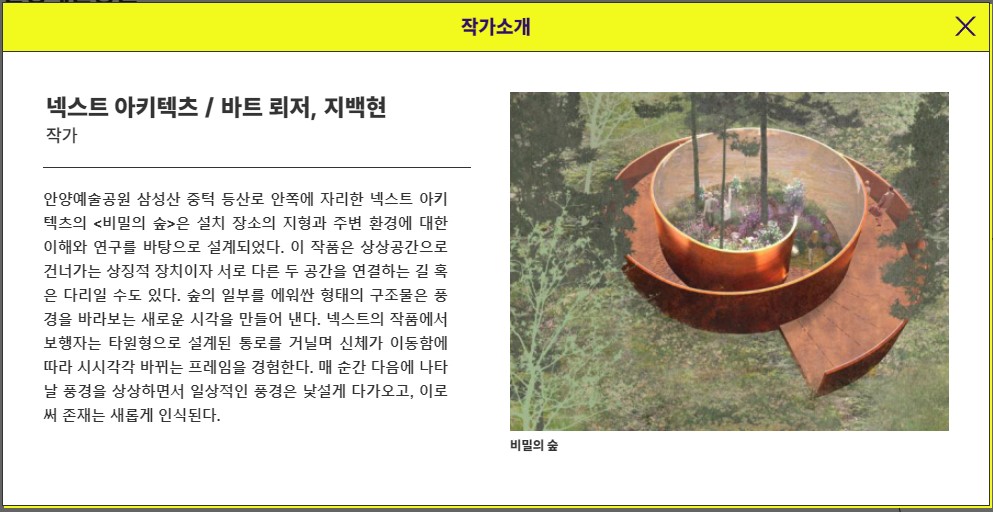 건축형 파빌리온, 구조적 모뉴멘트, 공공조각, 커뮤니티 아트, 무형의 콘텐츠 예술 등을 만나볼 수 있습니다.