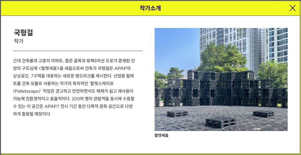 안양공공예술프로젝트(APAP)는 2005년에 처음으로 개최되어 2019년까지 6회까지 개최되었습니다.