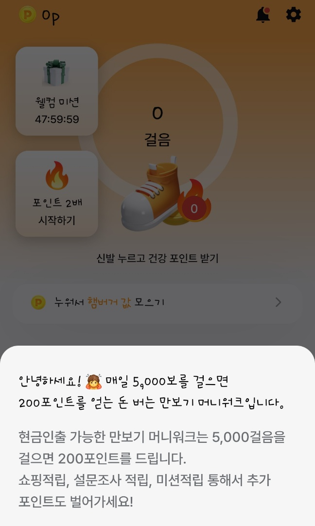 ✅ 1,000보를 걸으면 10원 5,000보를 걸으면 추가 10원, 1만보를 걸으면 20원을 포인트로 제공합니다.