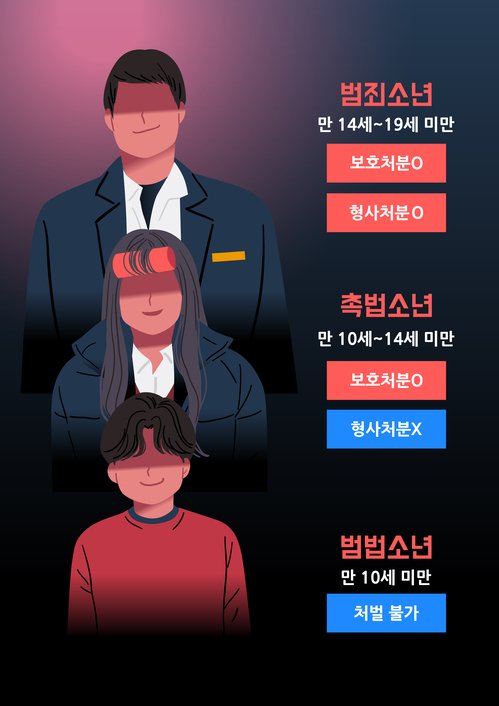 형벌을 받을 범법행위를 한 만10세 이상~14세 미만의 형사미성년자로 '14세가 되지 아니한 자는 행위를 벌하지 아니한다'라고 규정하고 있습니다. 이들은 형사 책임능력이 없기 때문에 형법에 저촉되는 행위를 하더라도 형사처벌을 하지 않고, 가정법원이 소년원으로 보내거나 보호관찰 을 하게 하는 등 '보호처분'을 할 수 있습니다.