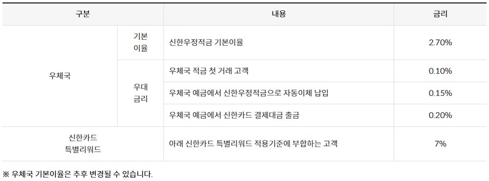 만기까지 유지 시 기본금리 2.7%에 우체국 신한 우정적금으로 자동이체 납입 등 조건 충족 시 우체국 우대금리로 0.45% 추가를 받을 수 있습니다.