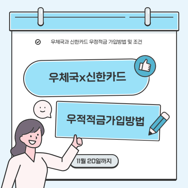 신한카드가 우체국과 함께 최대 연 10% 이상의 최고금리를 제공하는 적금이 새로 출시되었습니다. 가입은 오는 11월 20일까지 이고 각 지역 우체국 창구나 우체국 온라인채널을 통해 가입 가능 합니다.