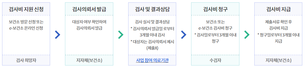 | 검사 및 결과상담 | 검사의뢰서 발급일로부터 3개월 이내에 사업참여 의료기관에 방문하여 검사 |