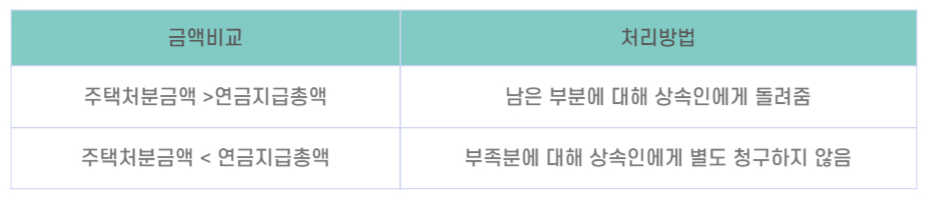 자녀 등에게 주택의 일부라도 상속 등으로 이전되며 대출금을 상환해야 하며, 대출잔액을 전액 현금으로 변제하는 경우에는 주택을 충분하지 않을 수 있습니다.
