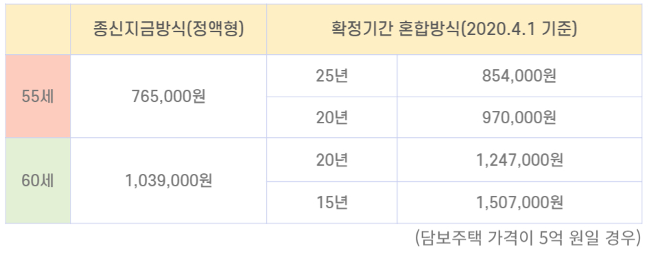 주택 가격에 변동이 없을 것으로 예상한다면, 가입시기는 늦출수록 월 수령액이 높습니다. 그리고 종신지급방식보다 확정기간 혼합방식의 월 수령액이 높으며 확정기간을 짧을수록 수령액이 높습니다.