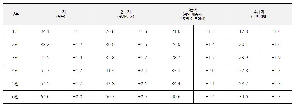 가구원수 | 1인 | 2인 | 3인 | 4인 | 5인 | 6인 |