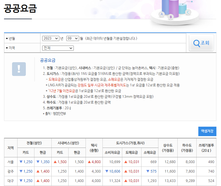 전철, 도시가스, 상수도, 하수도, 쓰레기봉투에 대한 가격비교입니다.