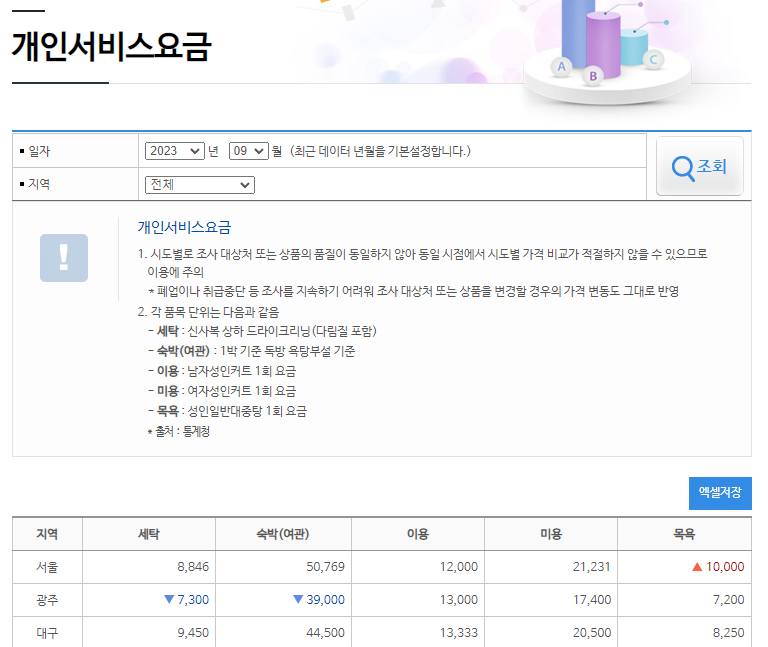 세탁 숙박(여관), 이용, 미용, 목욕에 대한 비용입니다.
