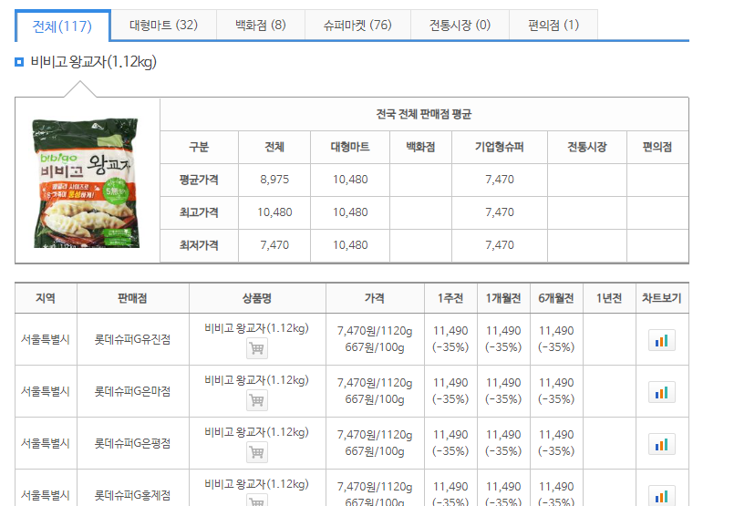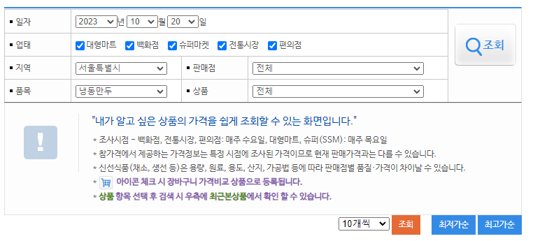 전국 단위 유통업체에서 판매하는 가공식품, 생활용품, 신성식품등 생필품 128개 품목(336개 상품)의 판매가격을