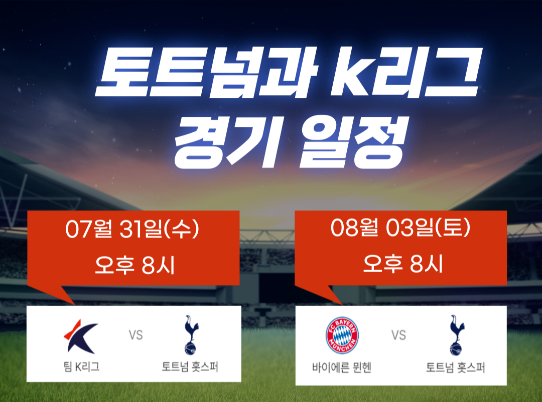 오는 7월 31일 오후 8시 서울월드컵경기장에서 K리그 선수들로 구성된 '팀 K리그'가 토트넘과 '쿠팡플레이 시리즈' 친선경기를 진행합니다. 이어 8월 3일에는 김민재의 소속팀 바이에른 뮌헨의 친선경기가 있으니 관심을 가져보시기 바랍니다.